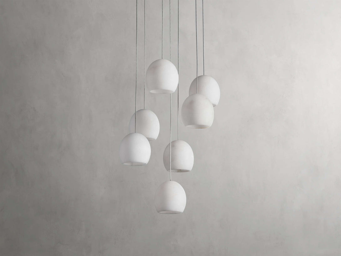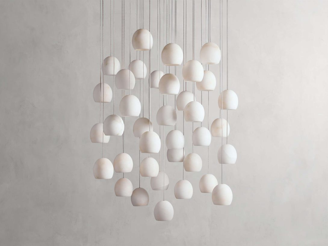 - Exposed airplane cable is complemented by a curved shade crafted from natural alabaster stone.