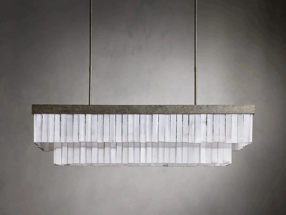 - Adorned with natural selenite crystals, our Cameron Lighting Collection reflects light as they hang elegantly beneath the iron frame. An antiqued silver finish is hand-brushed by our artisans, creating a glamorous aesthetic.