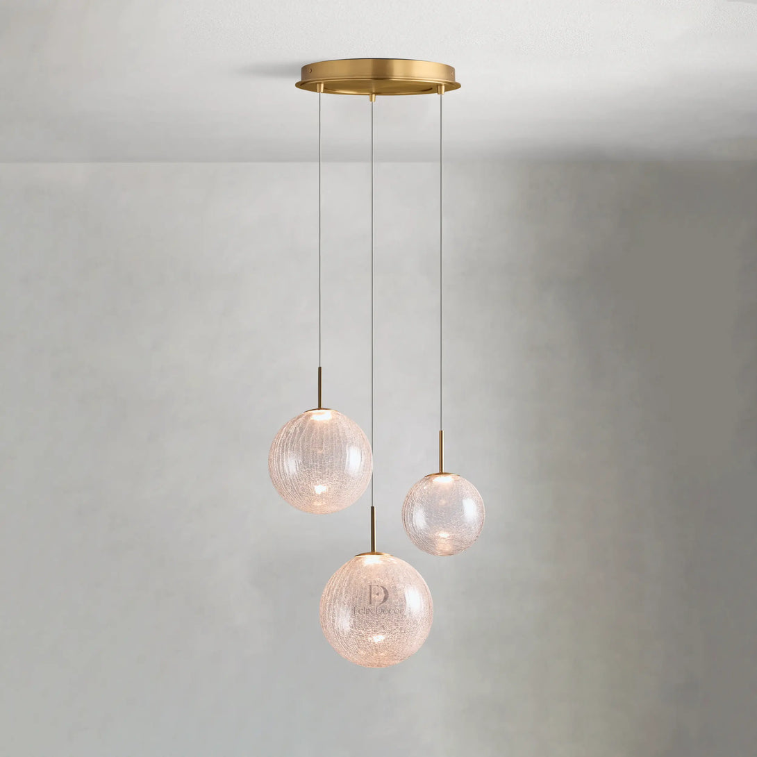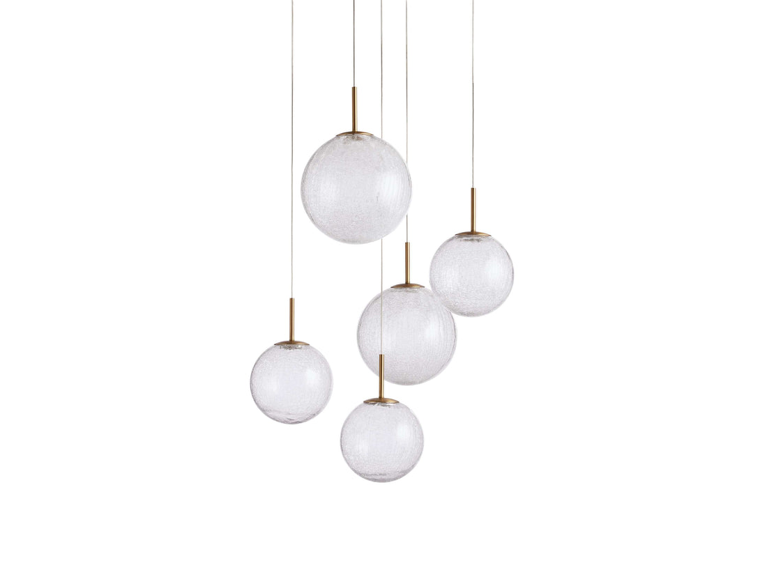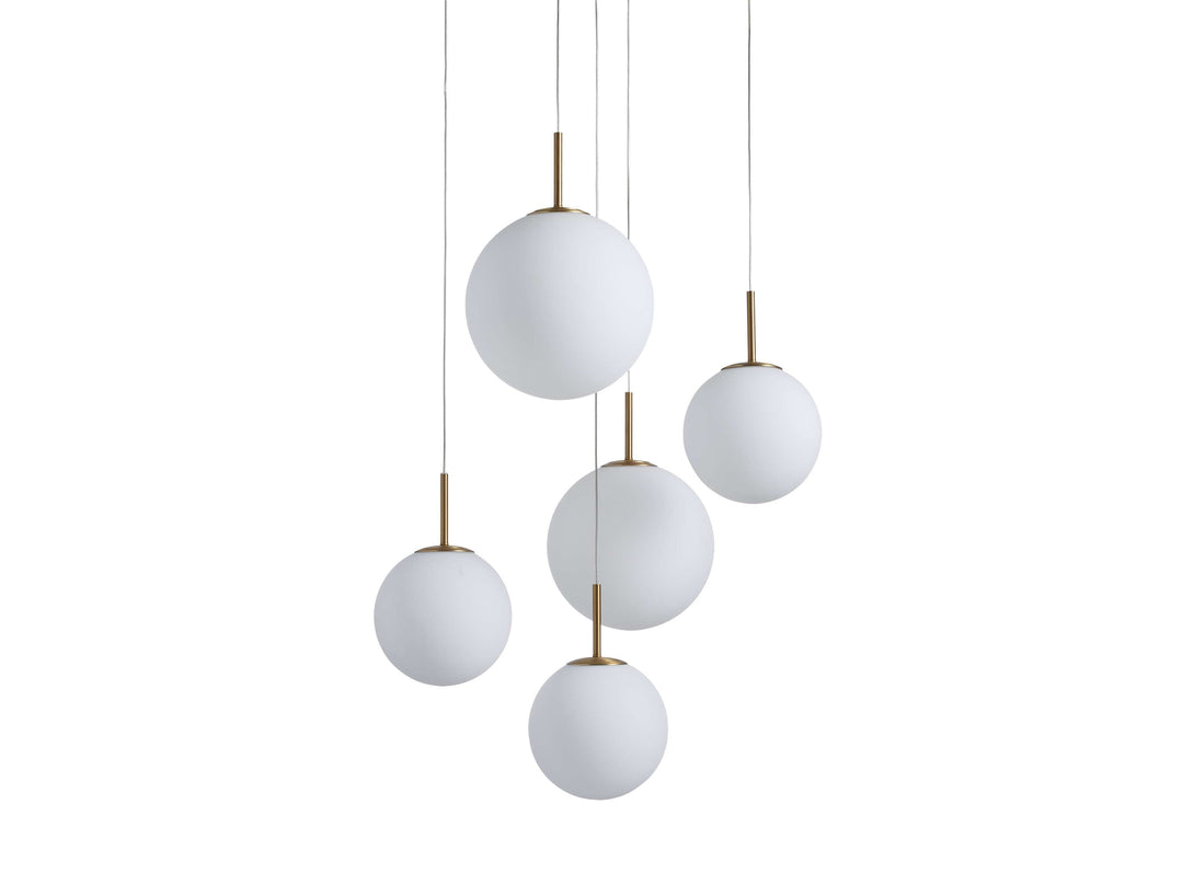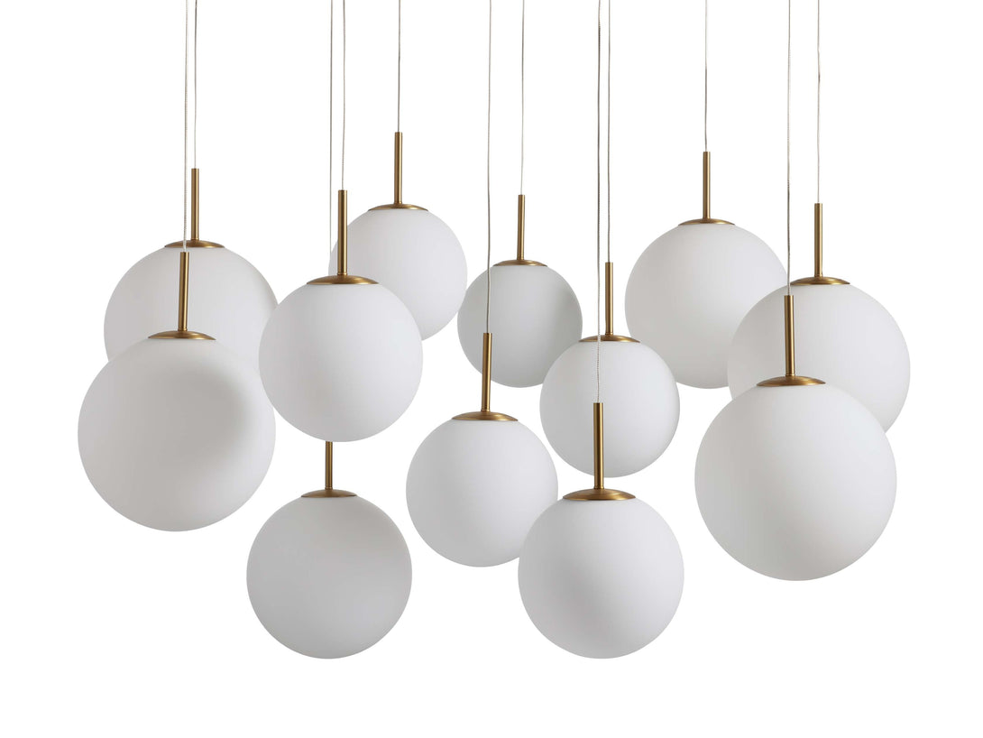 - Crafted from stainless steel with a satin brass finish and a mouth blown solid opal glass globe or crackle glass globe.