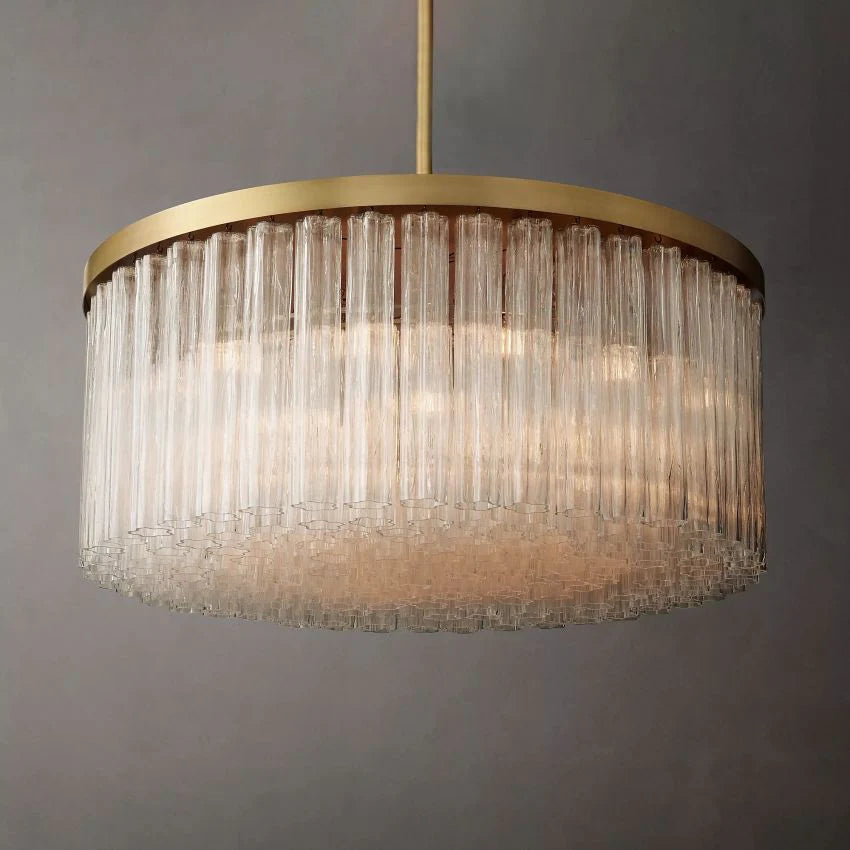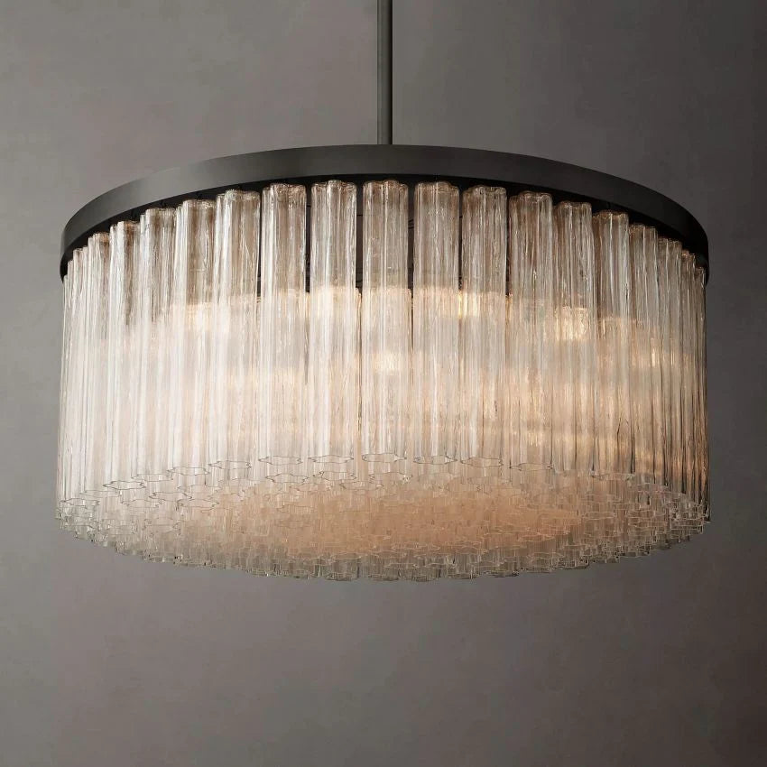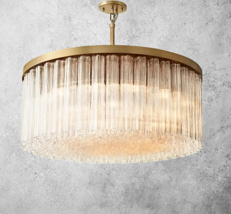 Our Cielito collection creates the stunning effect of liquid ice glistening with light. Layers of glass are composed of fluted cylindrical pendants, each mouth-blown with a smooth linear texture and loose floral shapes. From the bottom up, clusters of curved forms create a shimmering play of patterns.