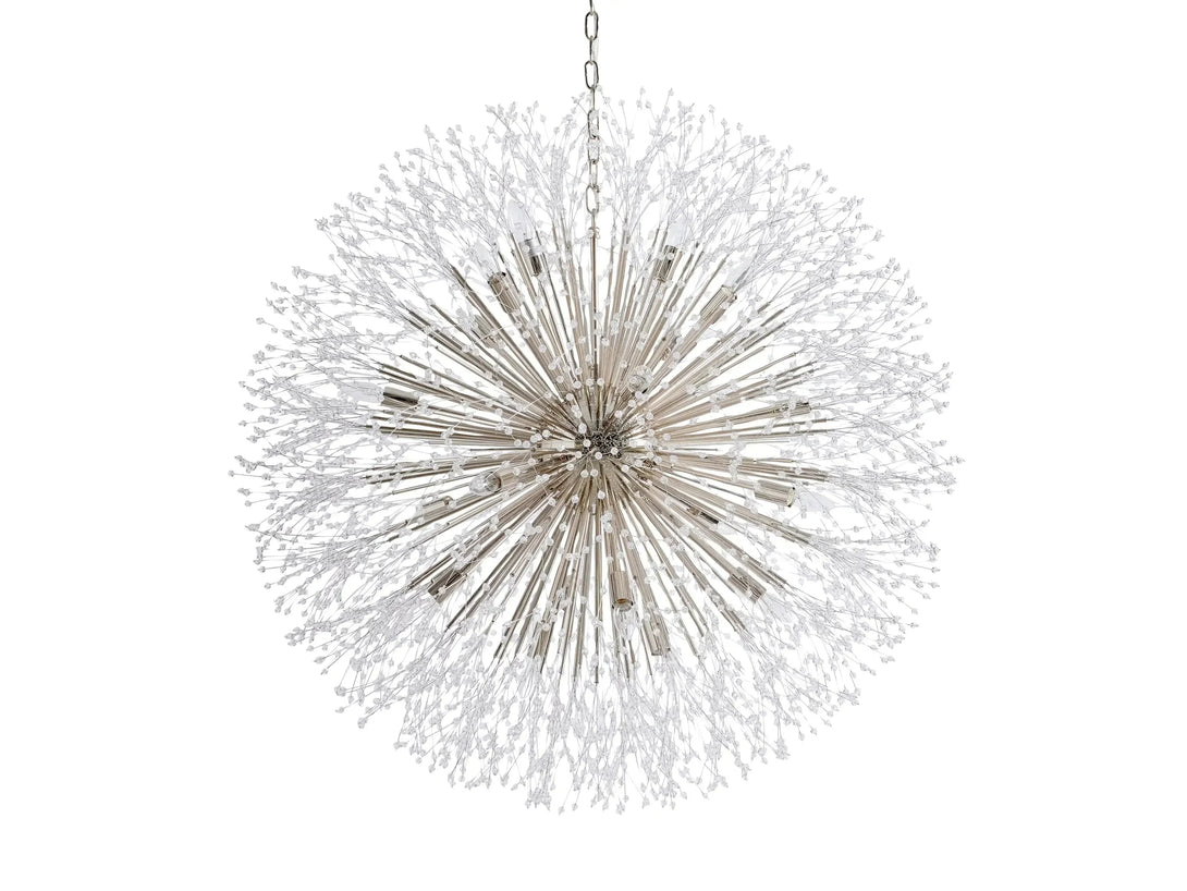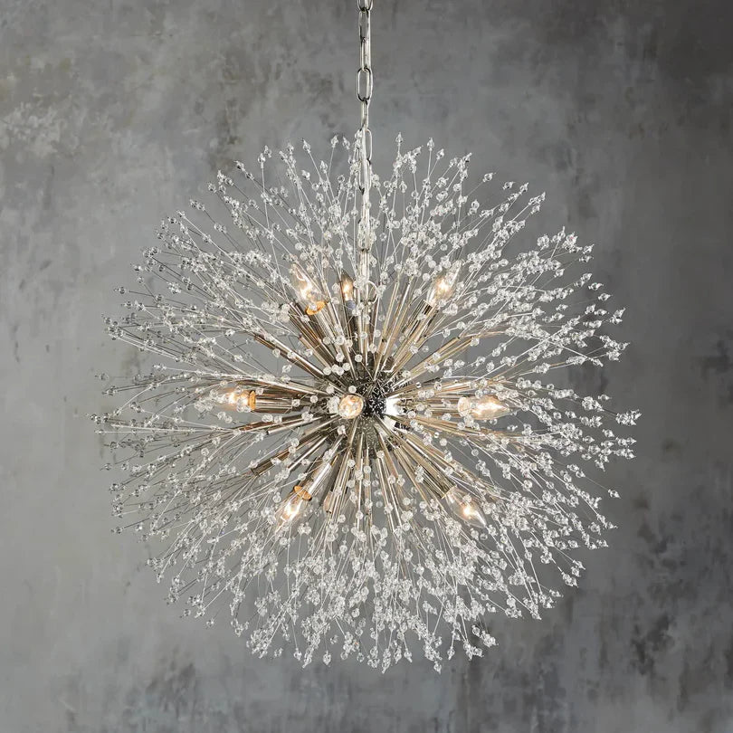 - Delightfully designed to resemble a dandelion after it’s blossomed, our elegant Dandelion Chandelier beautifully twinkles with reflected light. Crafted from nickel-plated iron with a painted finish, Dandelion’s radiating crystals will add whimsical wonder to any space.