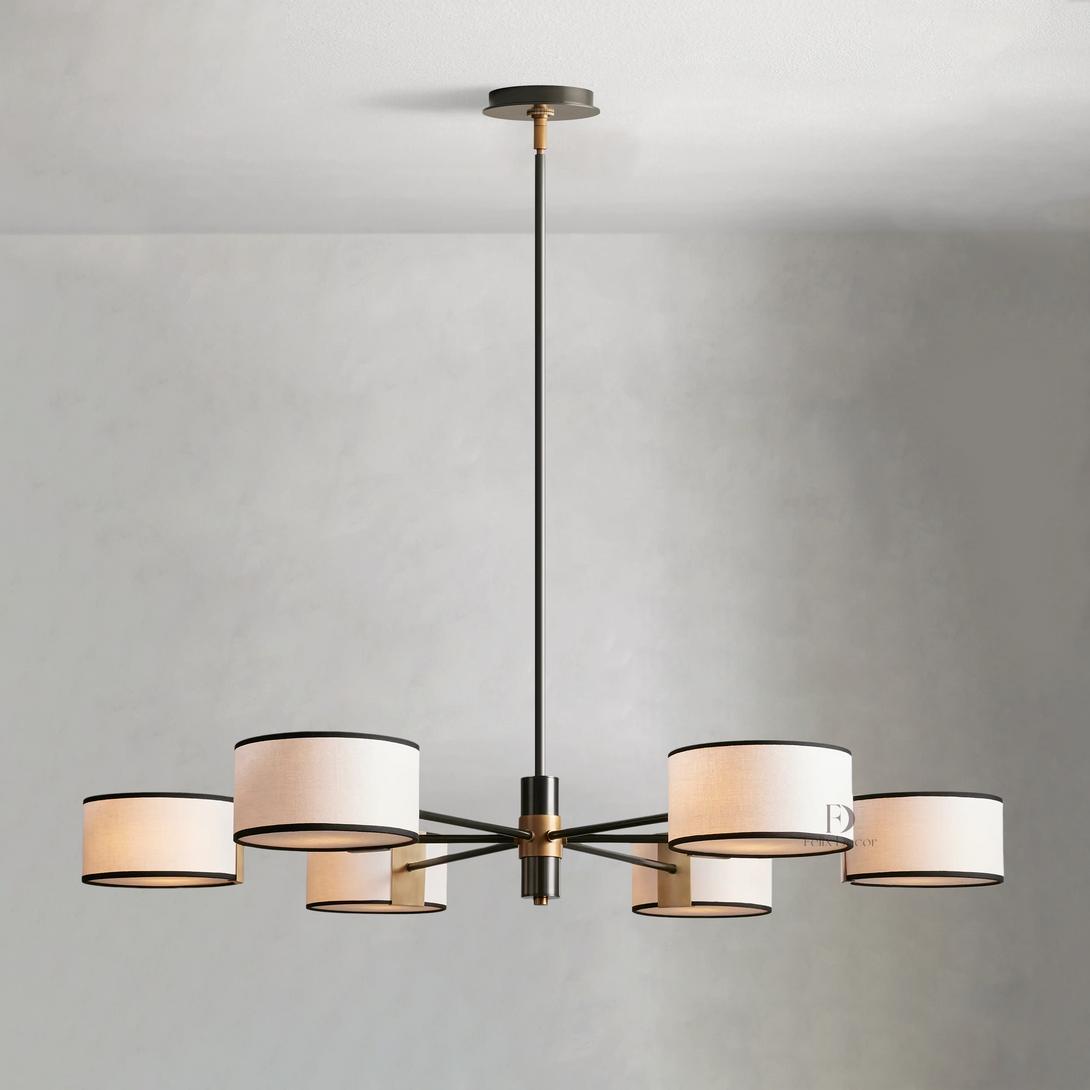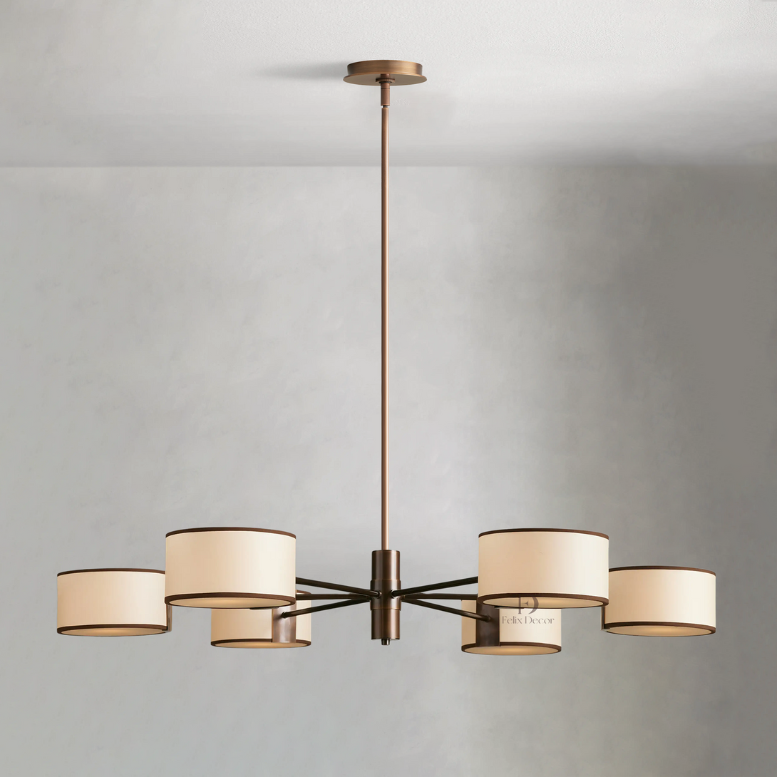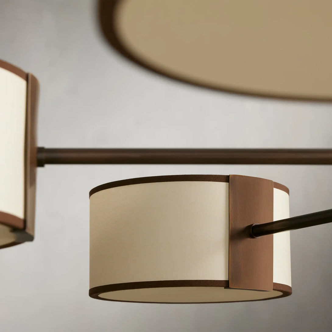 - Bronze fixtures include a white linen shade with black trim; light bronze fixtures include a cream parchment shade with brown trim.