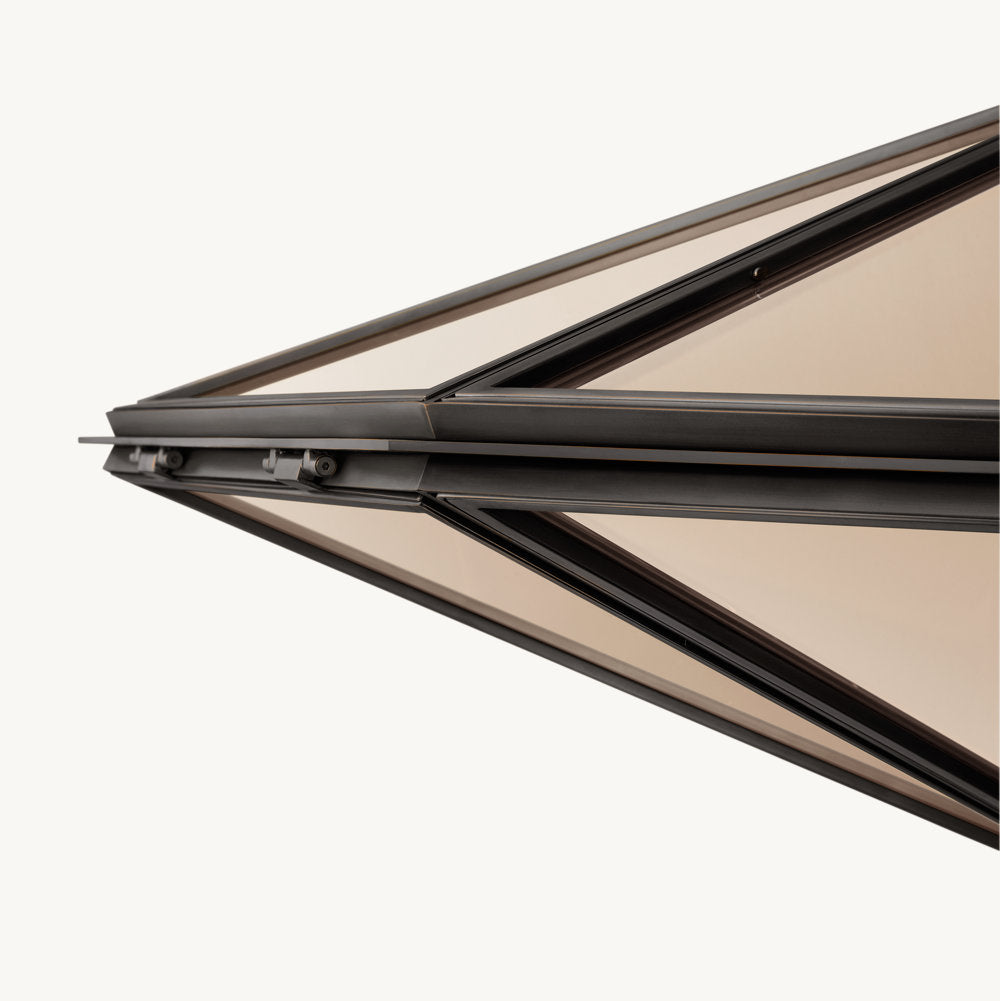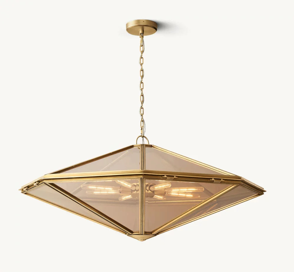 Set within a hexagonal frame, panels of smoky rose beveled glass reflect iconic elegance in the Helena chandelier. Capturing the minimalist spirit of contemporary geometric forms, its jewel-like, faceted design is eye-catching from every angle.