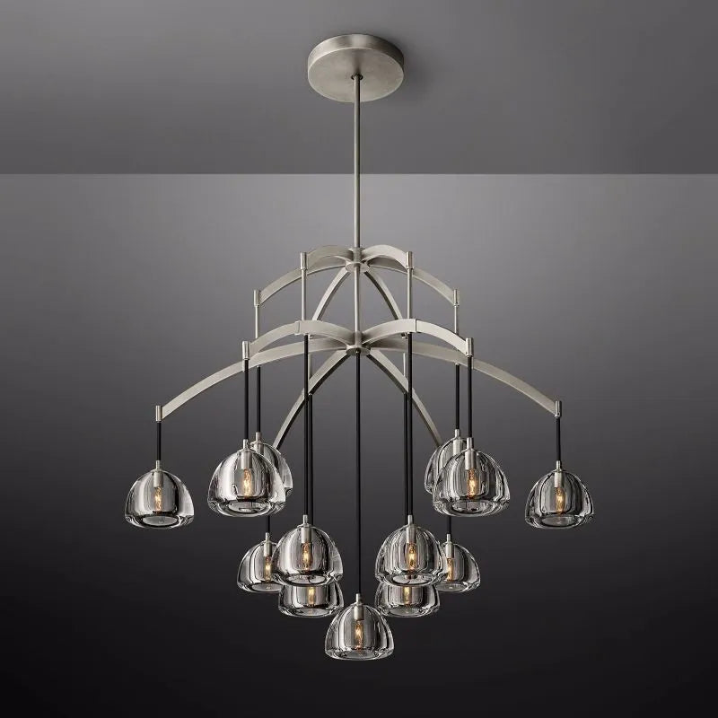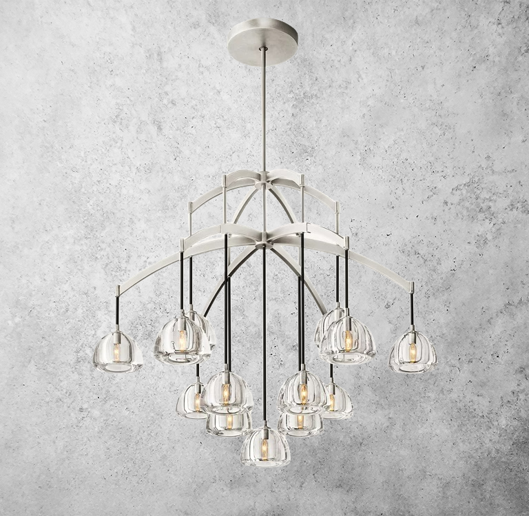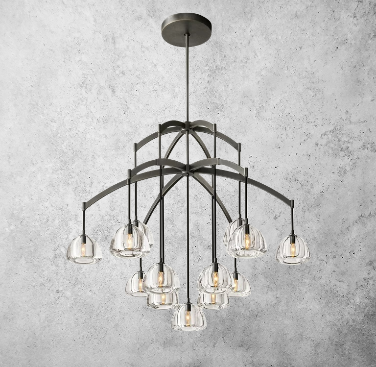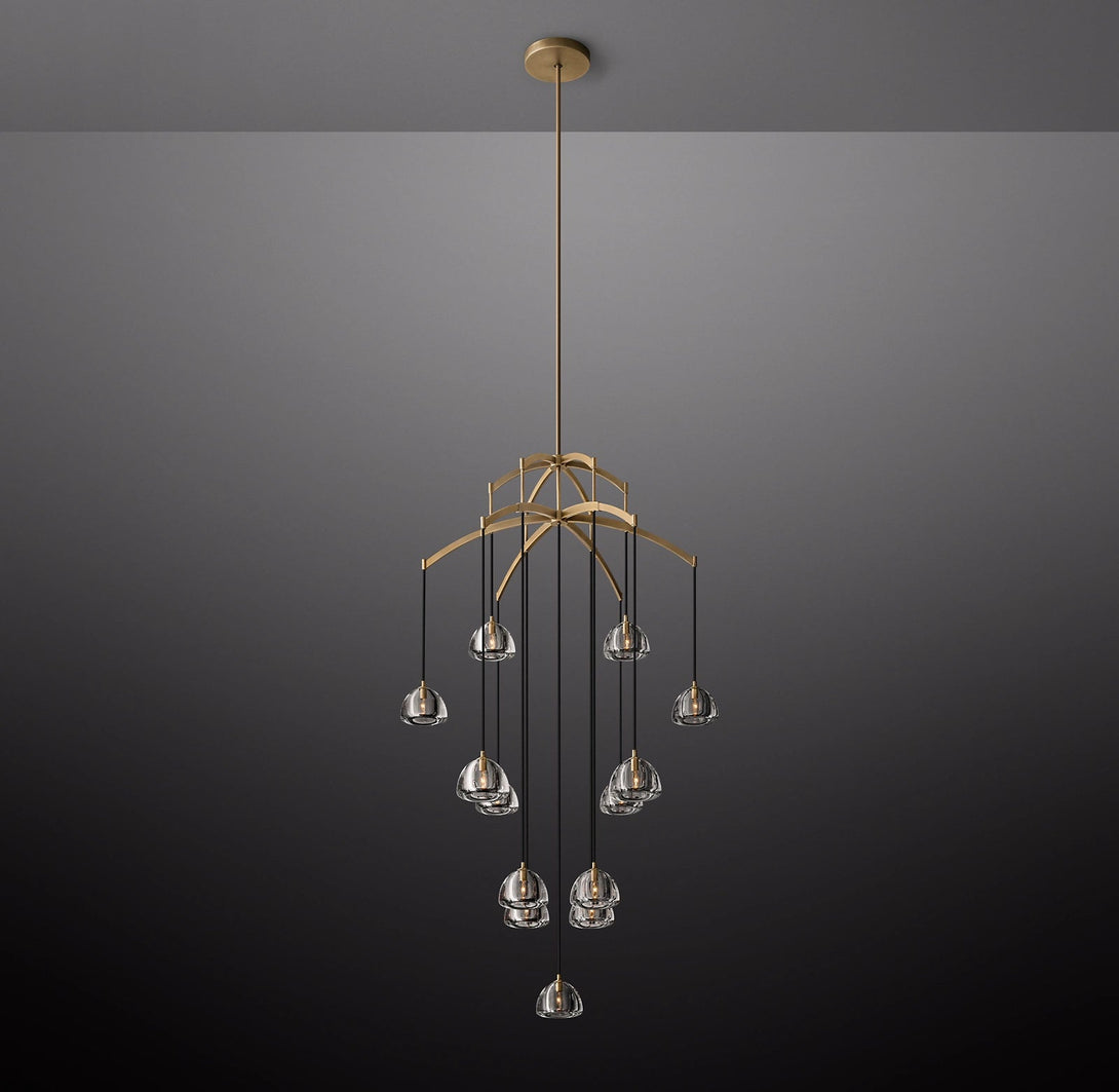 Lathe-carved from solid blocks of crystal and then hand polished, the thick, heavy domes play counterpoint to the solid brass frame's delicate arc a vision at once fixed and fluid, strong and fragile. Viewed as an object in space, the silhouette creates a canopy of light overhead.