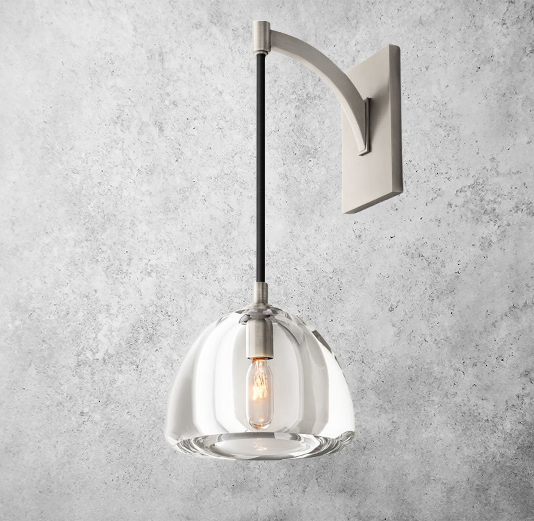 Evoking the 12th-century structure's flying buttresses, the fixture's winged armature holds aloft hemispheres of cross-cut glass. Lathe-carved from solid blocks of crystal and then hand polished, the thick, heavy domes play counterpoint to the solid brass frame's delicate arc – a vision at once fixed and fluid, strong and fragile. Viewed as an object in space, the silhouette creates a canopy of light overhead.