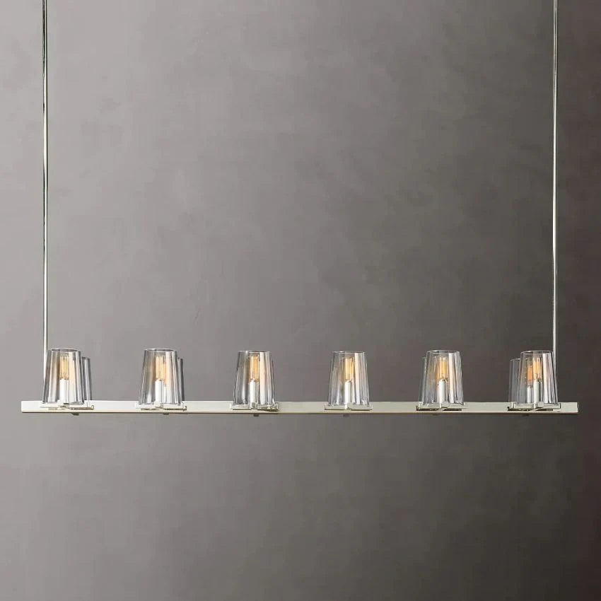 | This chandelier is suspended from a tiered steel frame with dozens of hand-blown glass polyhedra on individual hooks. Illuminated from within, the faceted chandeliers dramatically reflect and refract light. A tribute to the Italian lighting style of the 1950s with this minimalist style. |