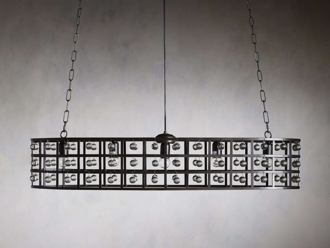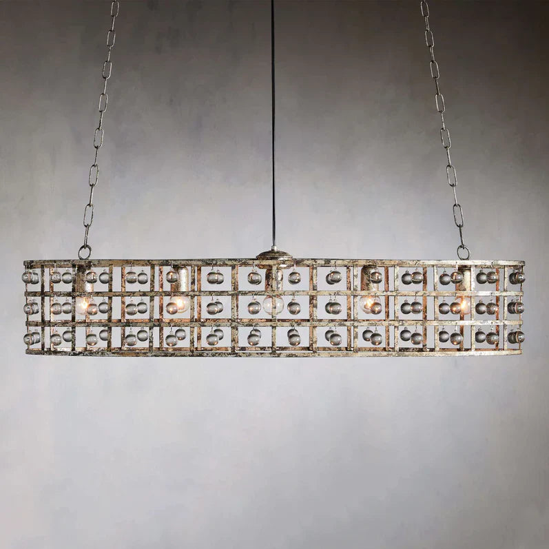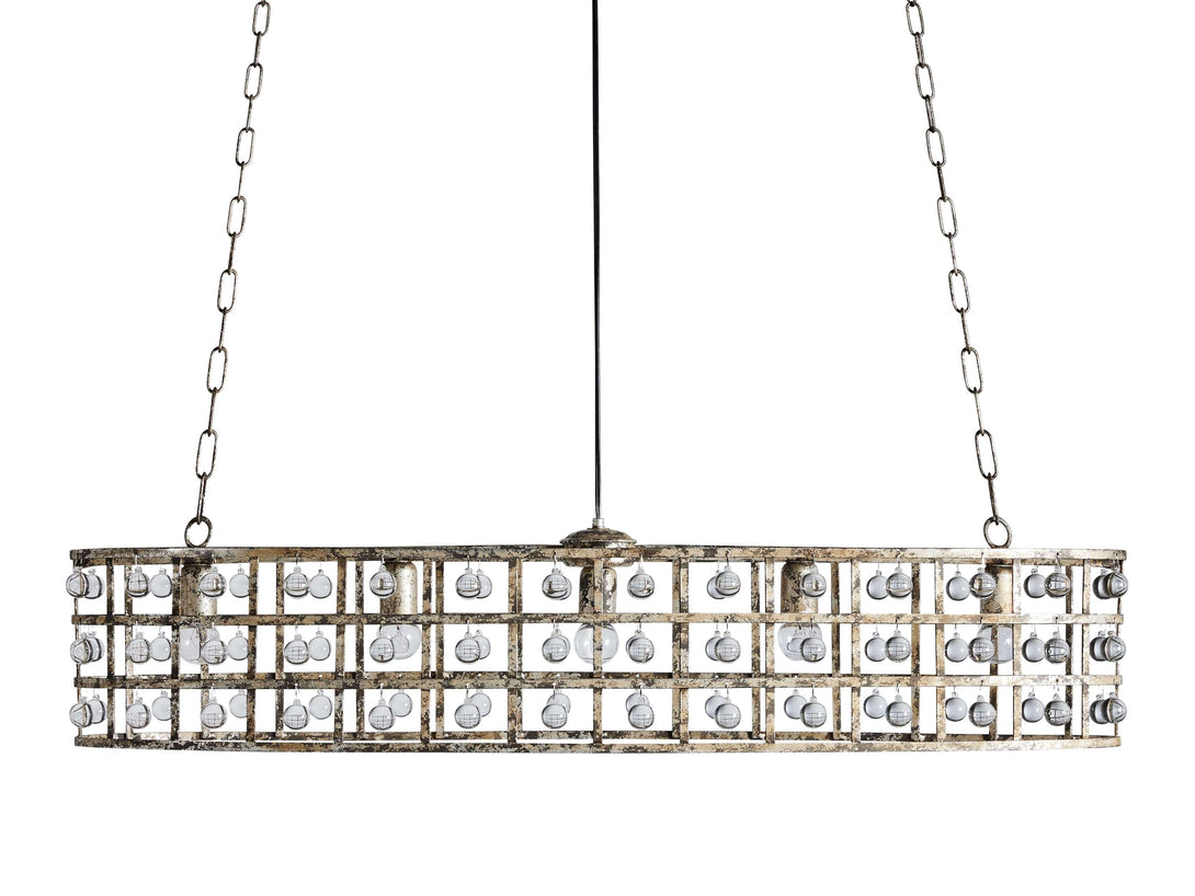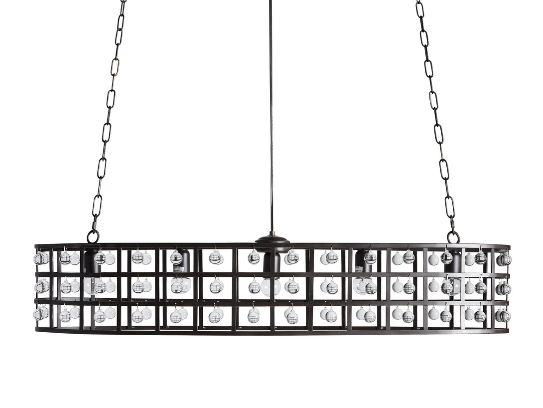 - Iron cage frame features an antiqued metallic finish complemented by Italian crystal spheres.