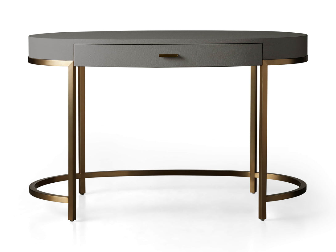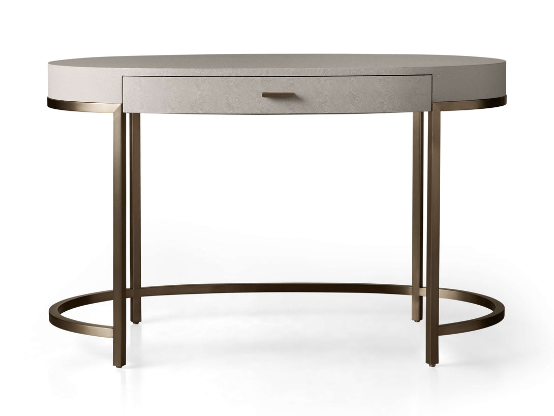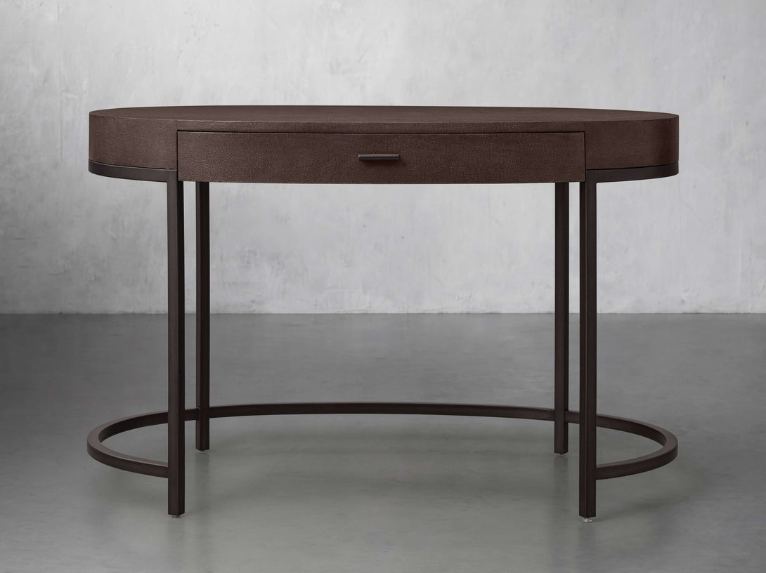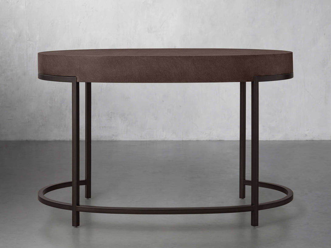 - Reconstituted leather insets are dyed and artfully embossed with textural shagreen detailing.