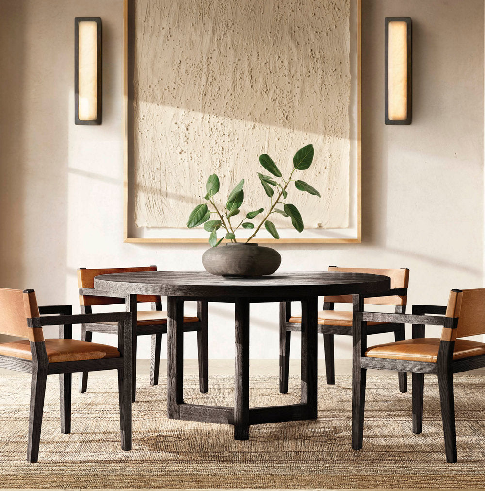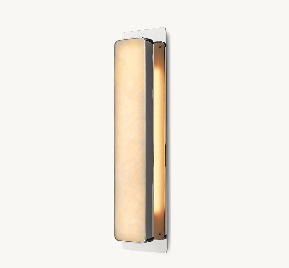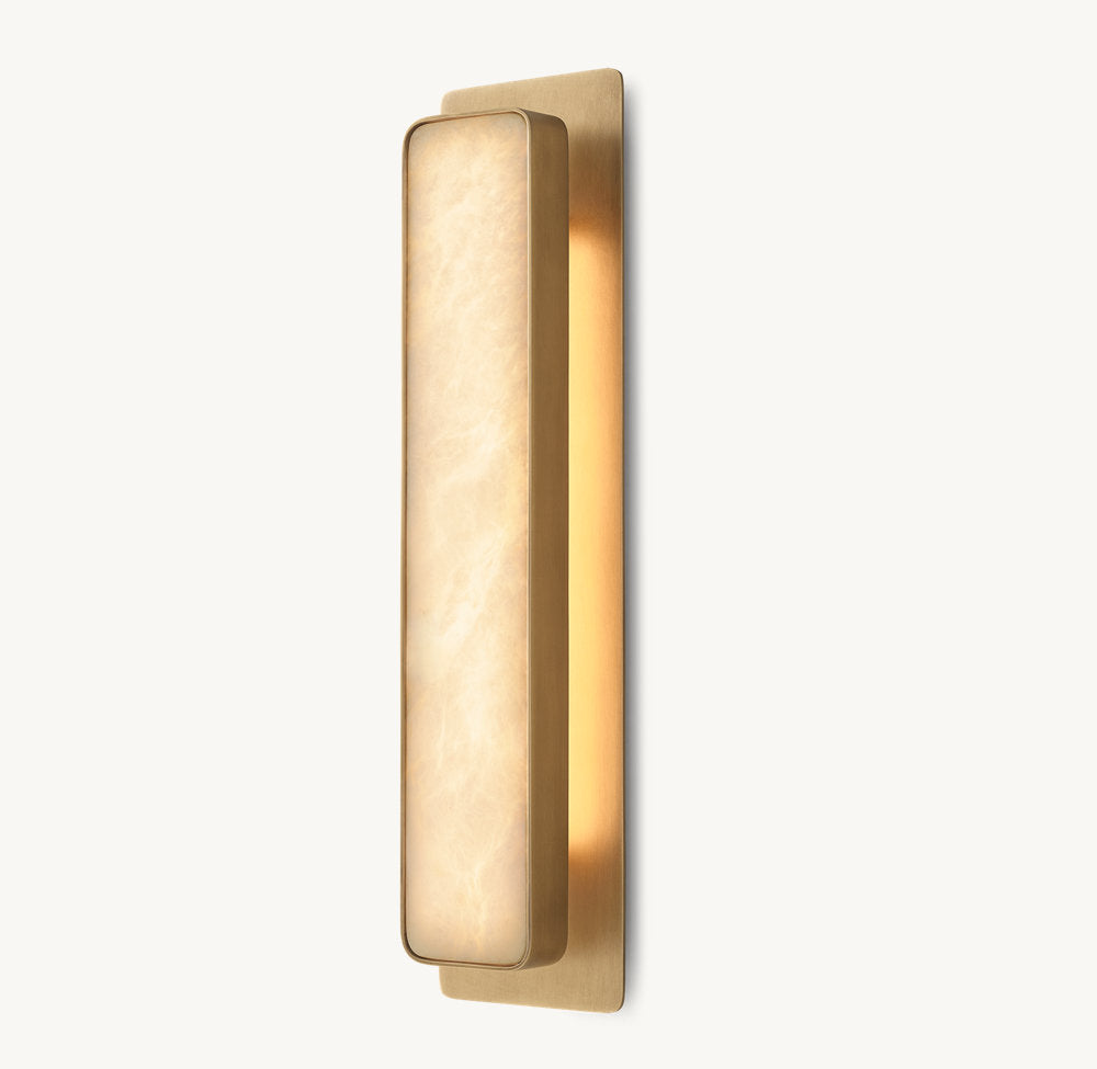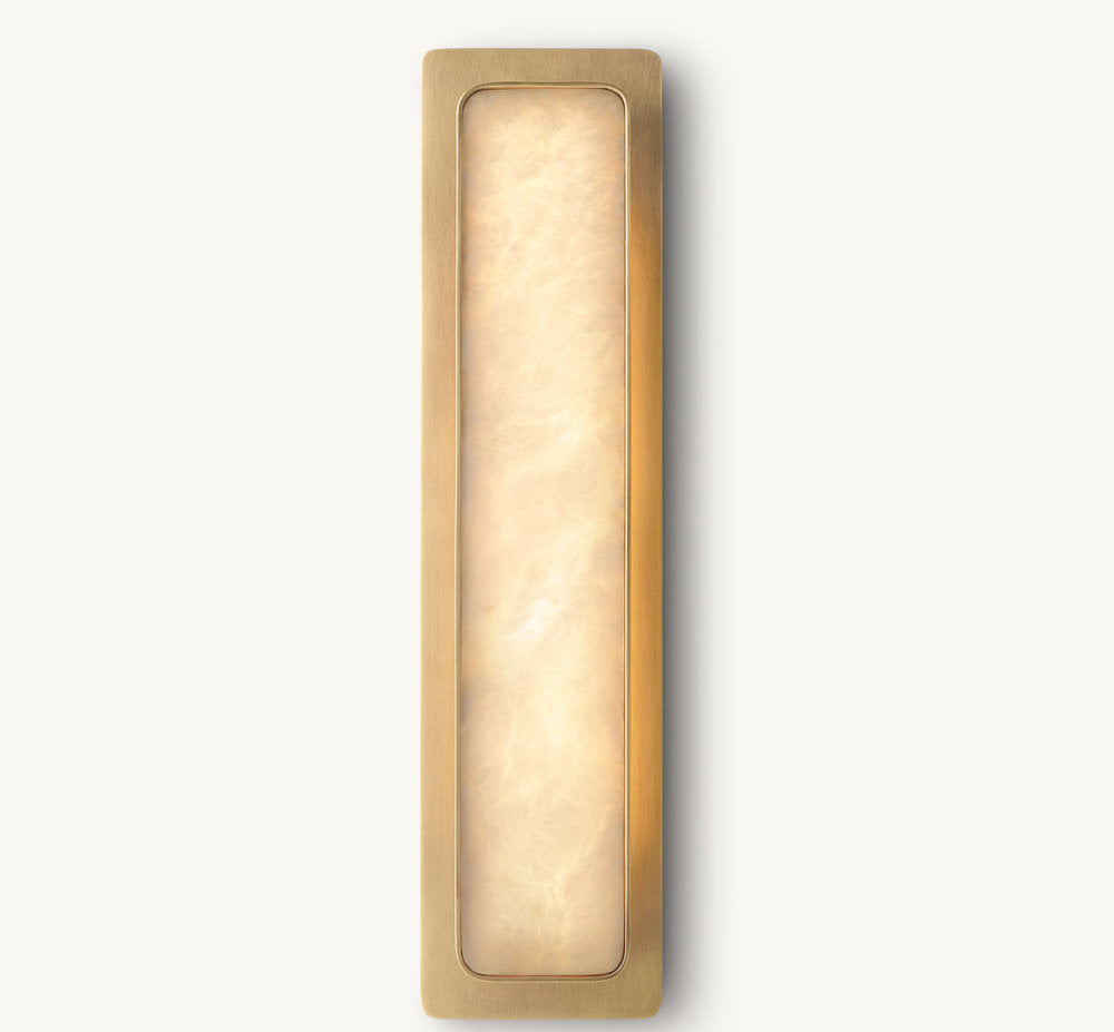 A spare geometric silhouette inlaid with natural alabaster lends our sconce by Ian K. Fowler its luxe postmodern sensibility. The hand-carved panel of translucent stone is encased in a metal frame, casting a warm glow that reveals rich veining and tonal beauty. Casting a soft backlight, Montreux produces a subtle floating effect.