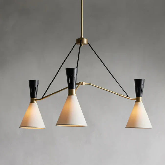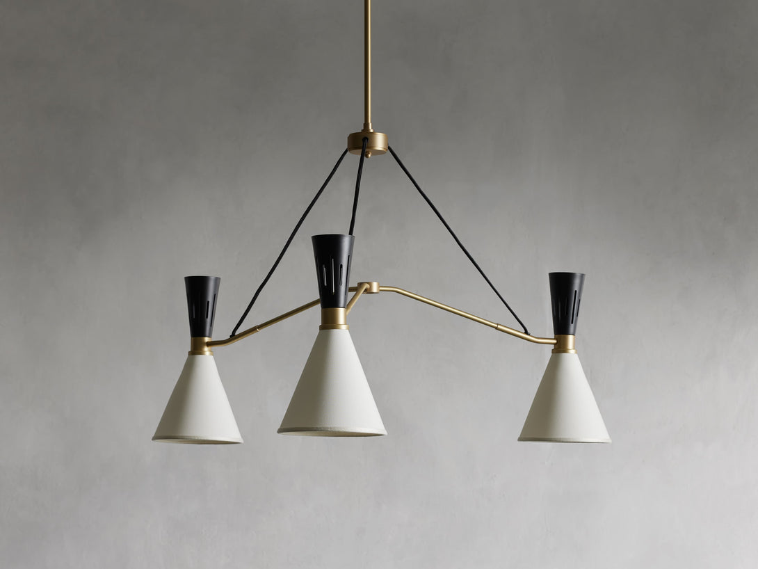 - Frame made from brass. Shades made from iron featuring a matte black finish and white fabric.