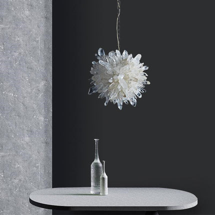 Introducing a modern pendant light featuring a stunning quartz crystal chandelier. This adjustable fixture is made of chrome metal and geode quartz crystal, available in diameters ranging from 9'' to 20'' with a maximum drop of 79 inches. Illuminate your space with elegance and style, as the light refracts through the exquisite crystals, creating a captivating ambiance.
