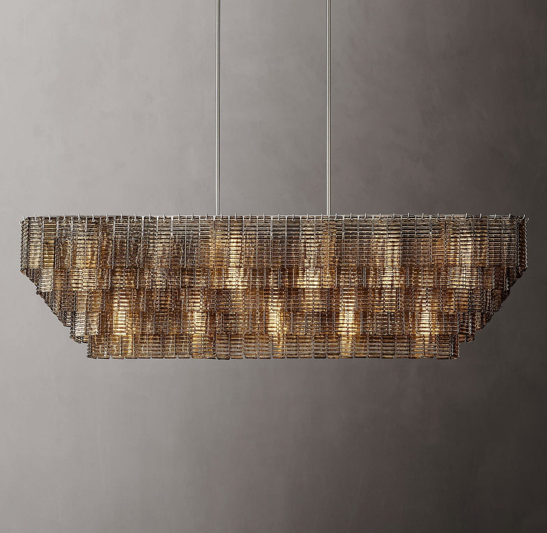 Our chandelier combines traditional glassmaking techniques with modernist style. A study in geometric repetition, the textured cast glass ribbons cascade in concentric circles, casting a warm glow to stunning effect.