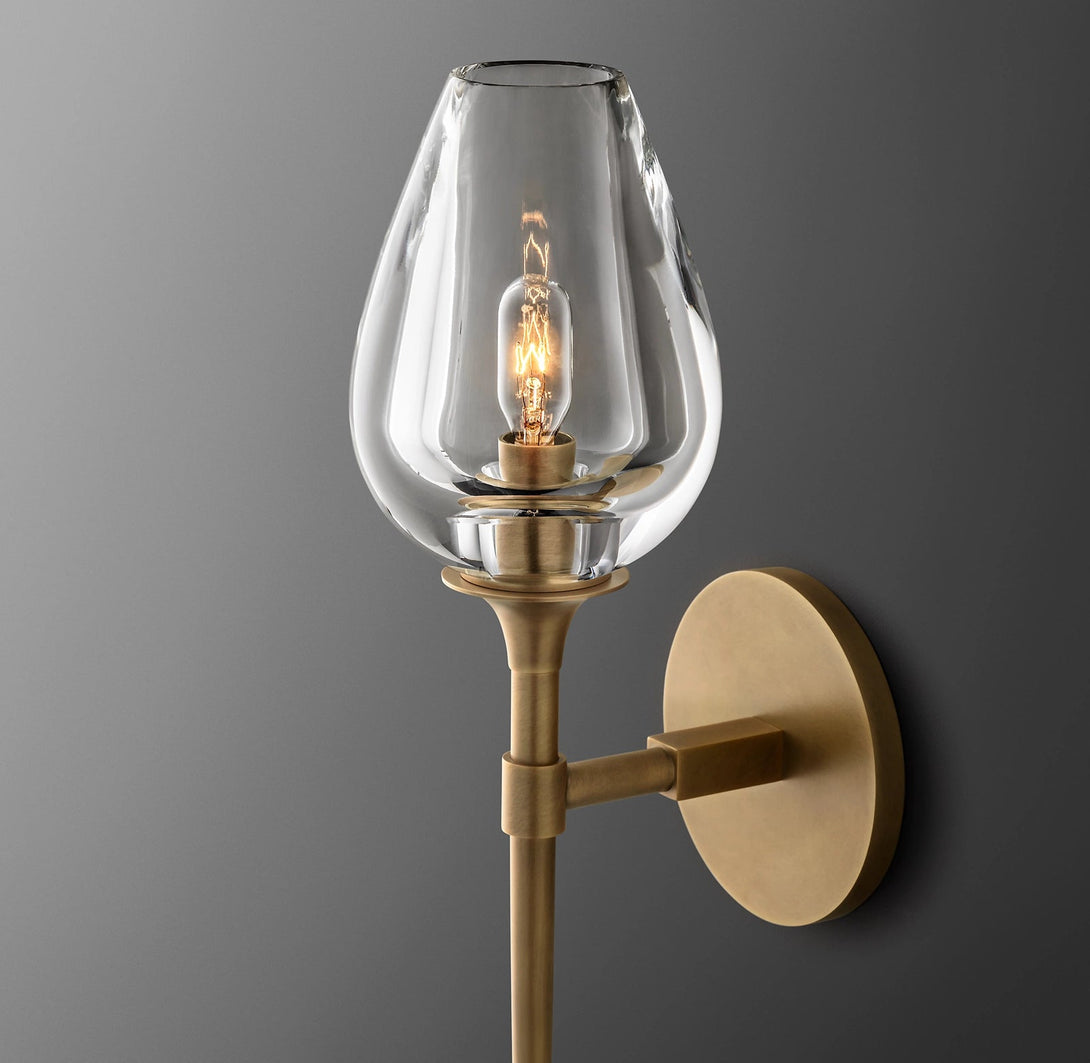 Lathe-carved from solid blocks of crystal and then hand polished, the glass torchieres' graduated thickness captures a petal's delicate contours while casting a warm, atmospheric glow. An understated brass armature secures the fluid forms, evoking stems fixing the ephemeral flowers in space.