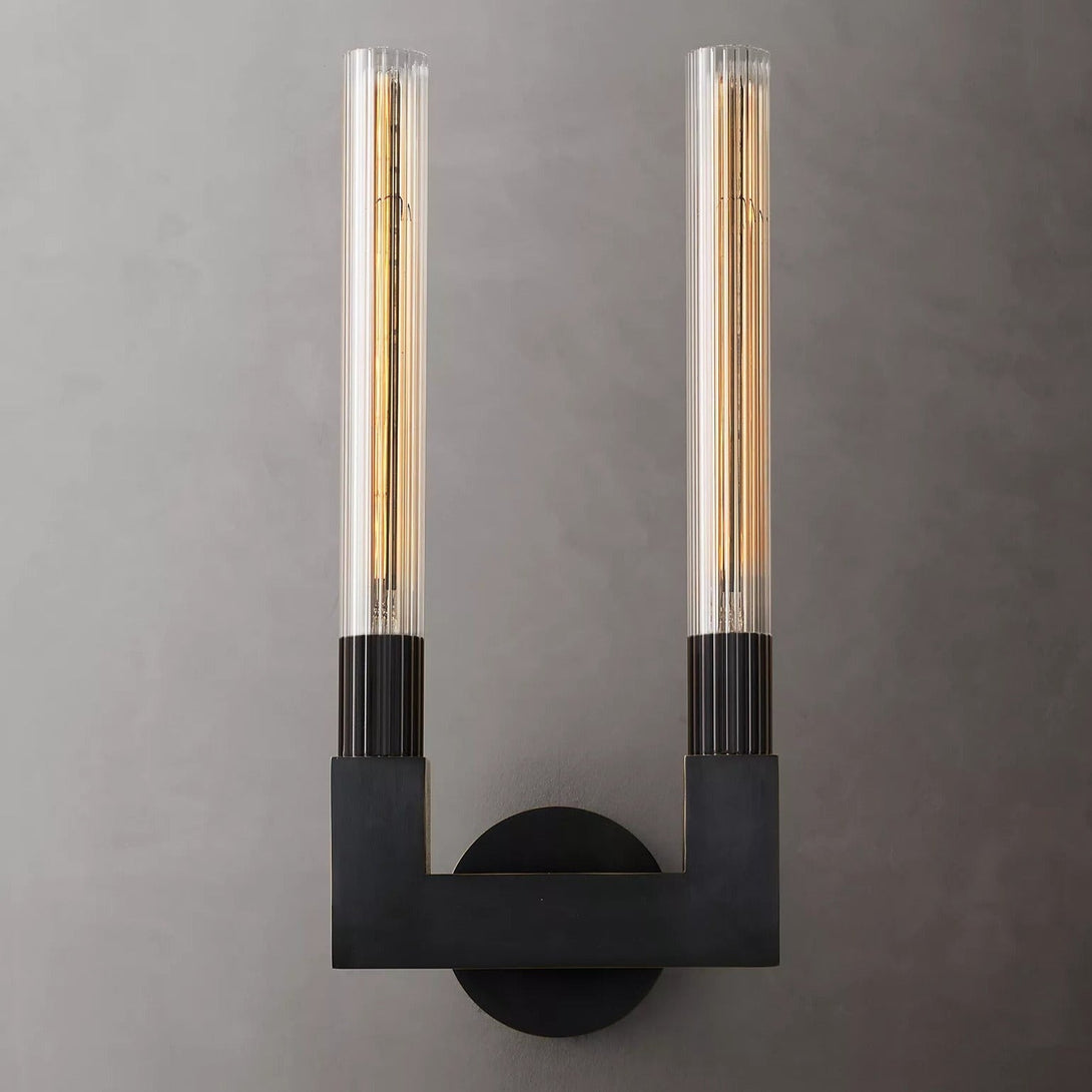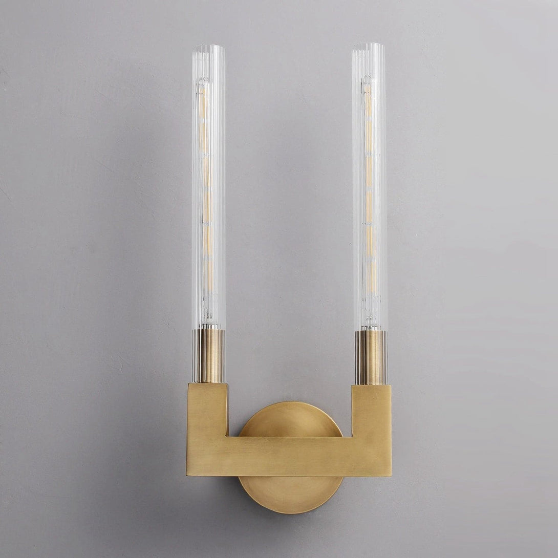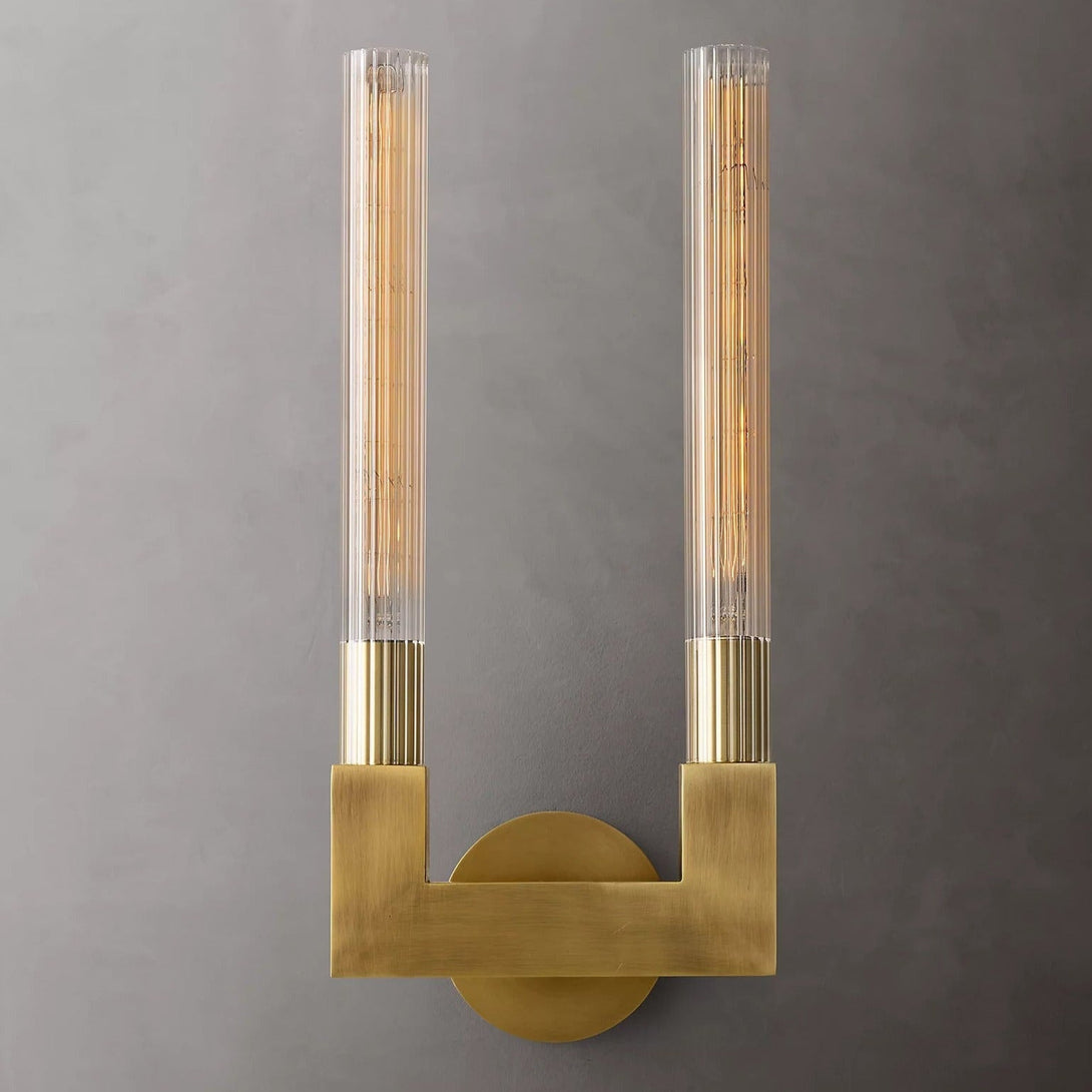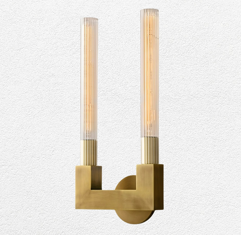 This wall sconce is made of solid brass and the Hurricane is made of corrugated borosilicate glass for durability and brilliance. It reinterprets the form of the American art chandelier in solid brass. Featuring clean lines and sharp angles, the fixture's elegant prismatic glass hurricane showcases an Edison filament bulb that flickers inside like a candle.
