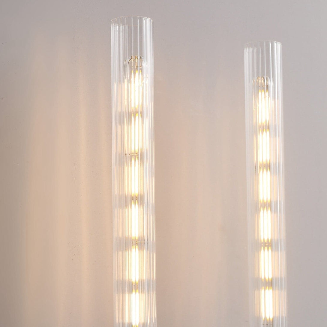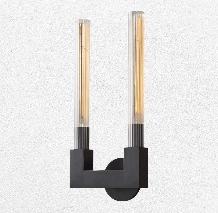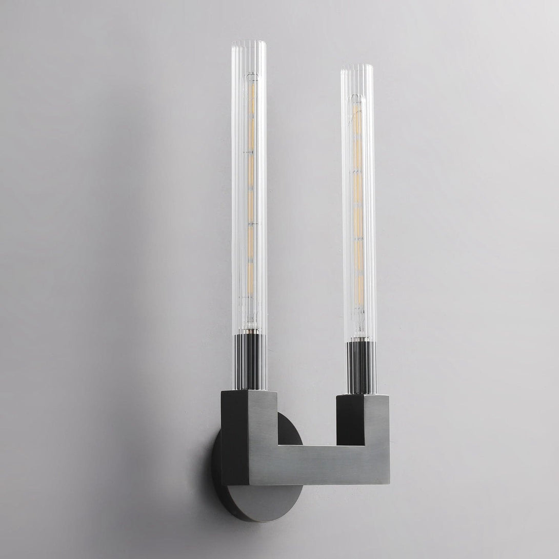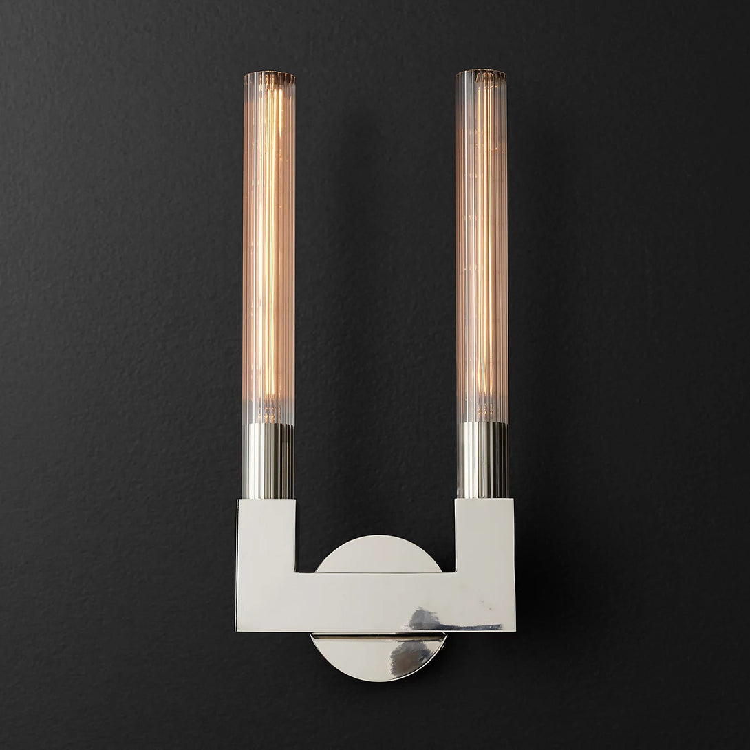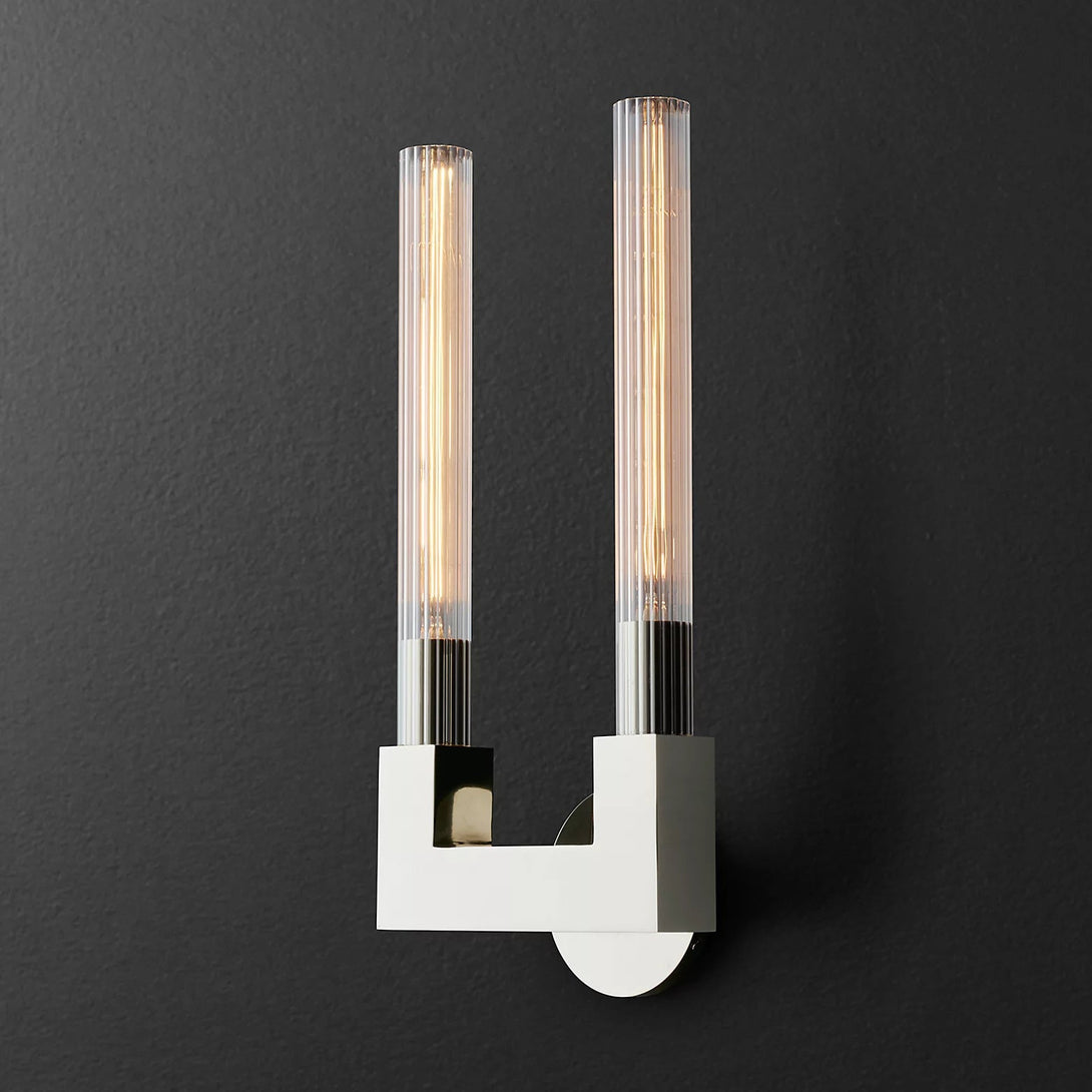 This wall sconce is made of solid brass and the Hurricane is made of corrugated borosilicate glass for durability and brilliance. It reinterprets the form of the American art chandelier in solid brass. Featuring clean lines and sharp angles, the fixture's elegant prismatic glass hurricane showcases an Edison filament bulb that flickers inside like a candle.