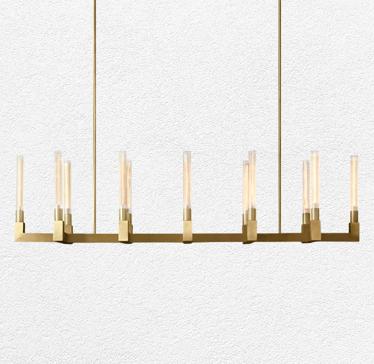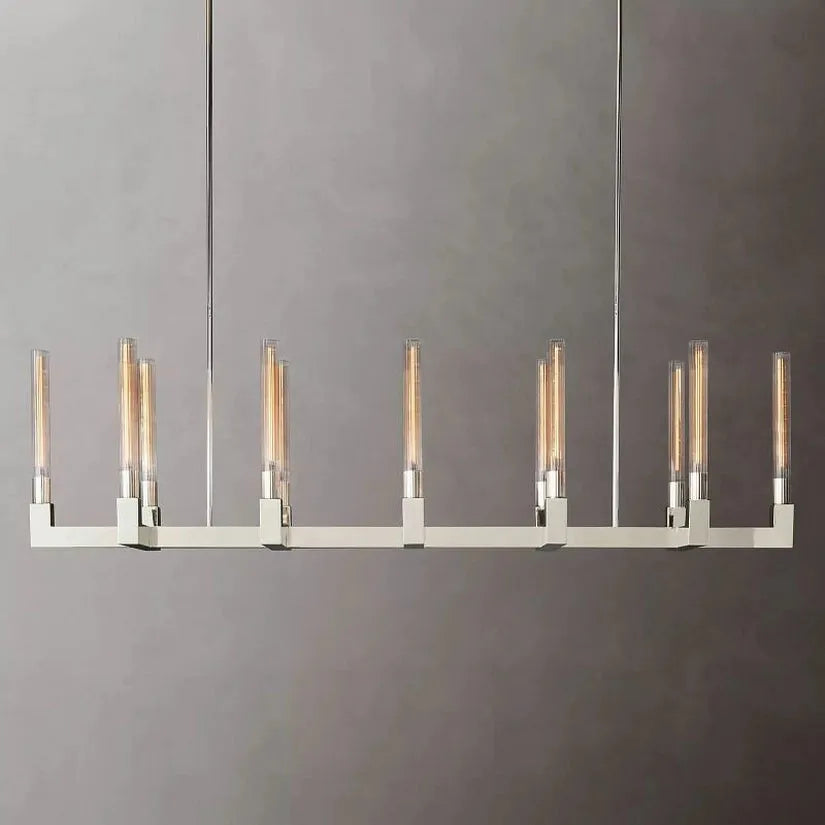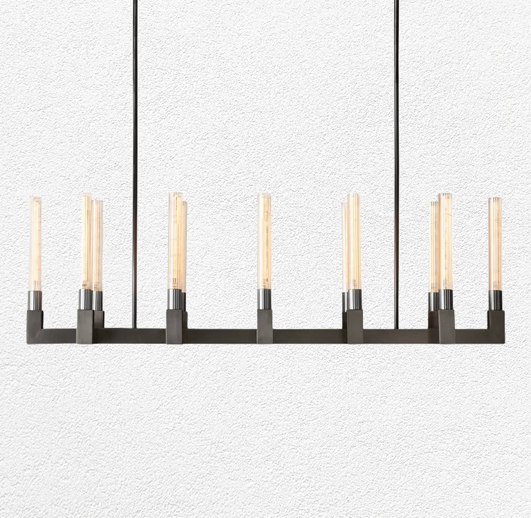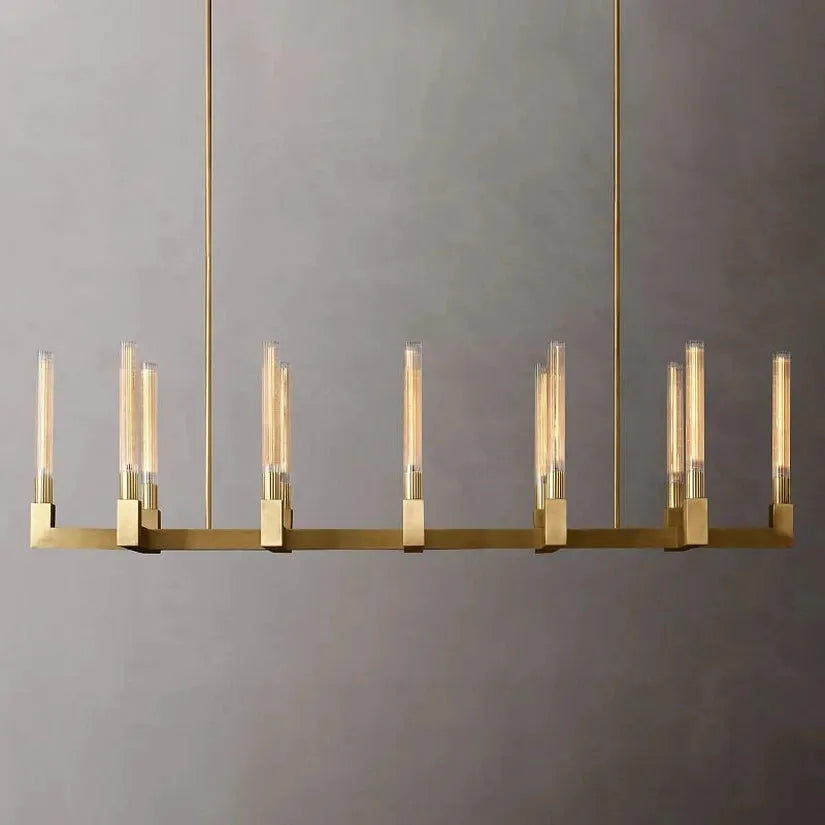 This chandelier is made of solid brass and hurricane made of corrugated borosilicate glass for durability and brilliance. It reinterprets the American art chandelier form with solid brass. Featuring clean lines and sharp angles, the fixture's elegant prismatic glass hurricane showcases an Edison filament bulb that flickers inside like a candle.